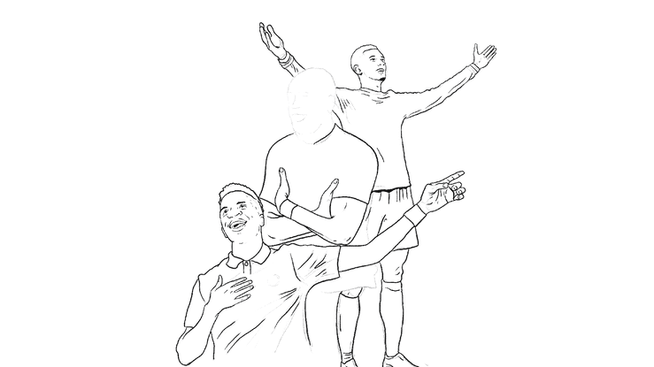 Line drawing of three people in expressive poses, with one person smiling and hand on chest, another with arms outstretched, and a third appearing to gesture or dance.
