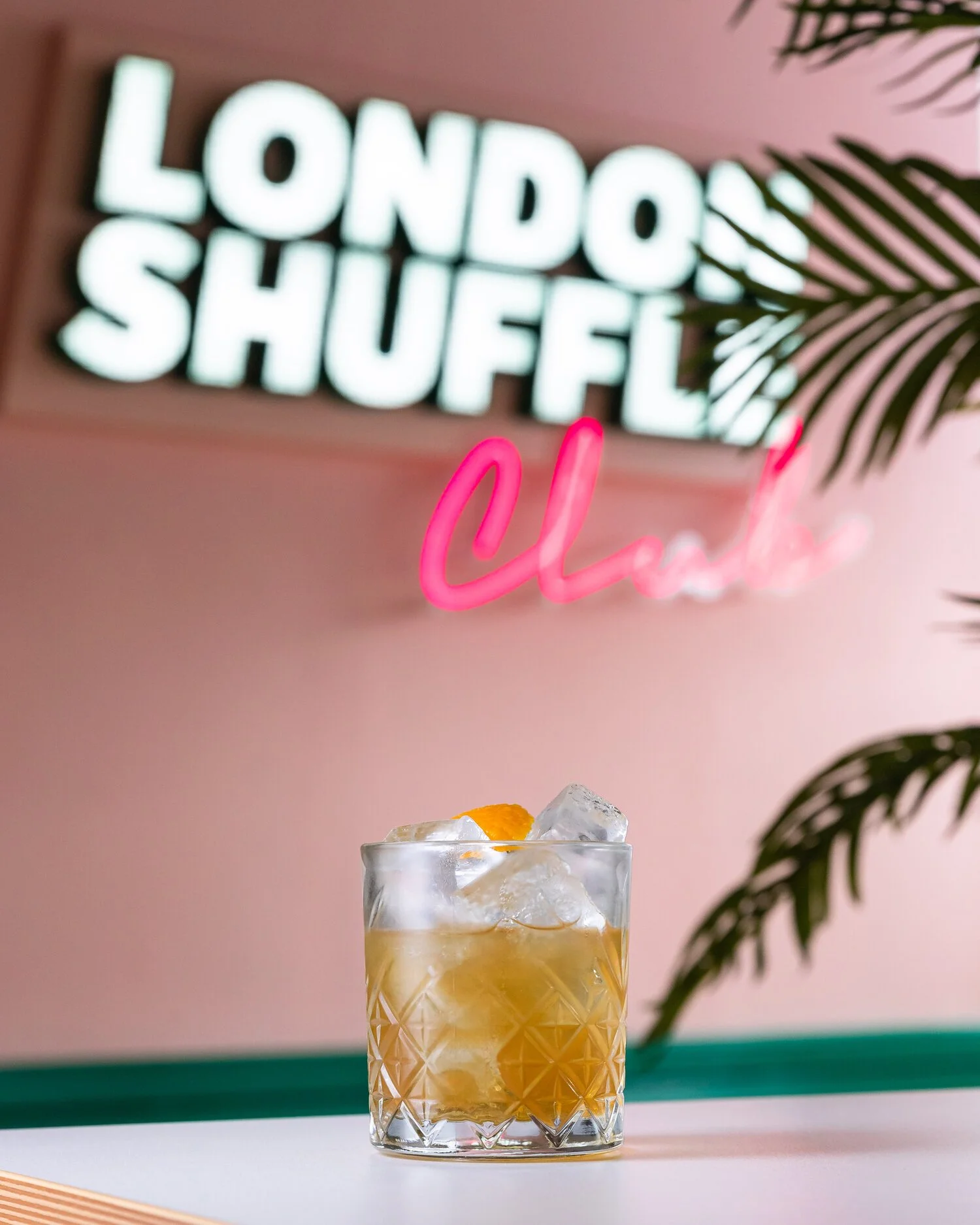 A glass of cocktail with ice and orange peel garnished, on a table with a pink background, neon sign reading 'London Shuffle Club', and tropical plant leaves.