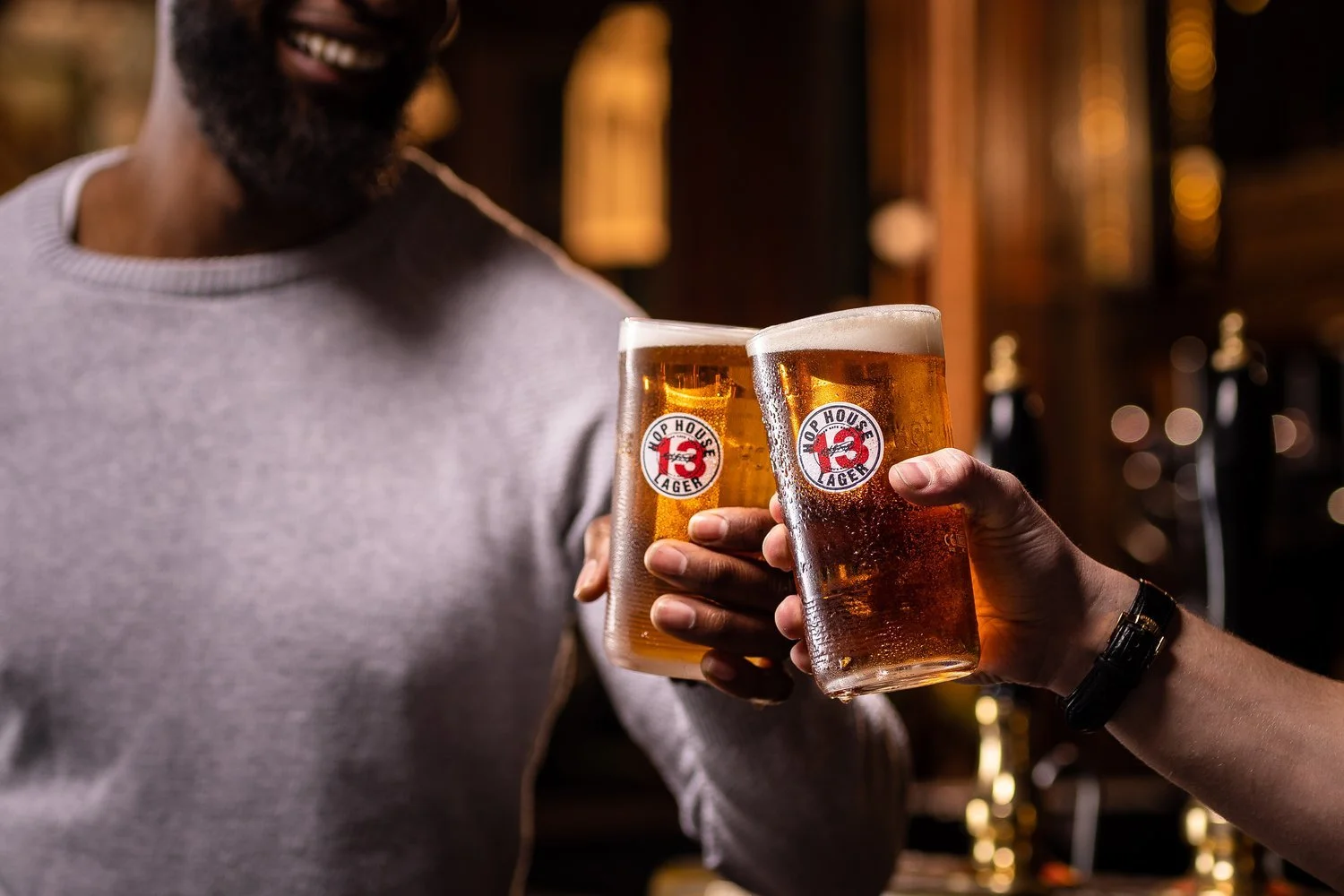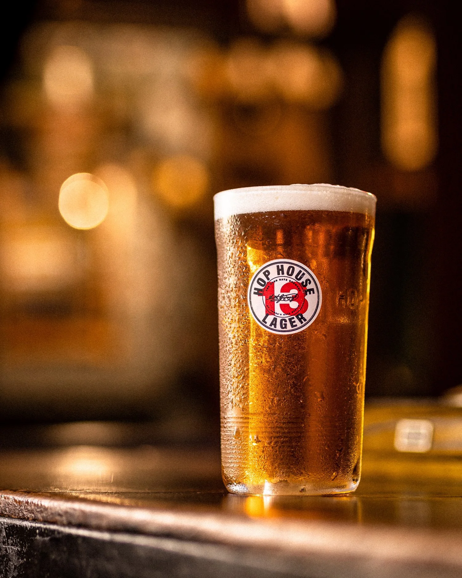 A cold glass of Hop House Lager beer with condensation, sitting on a wooden surface in a dimly lit bar or pub, with a blurred background of warm lights.