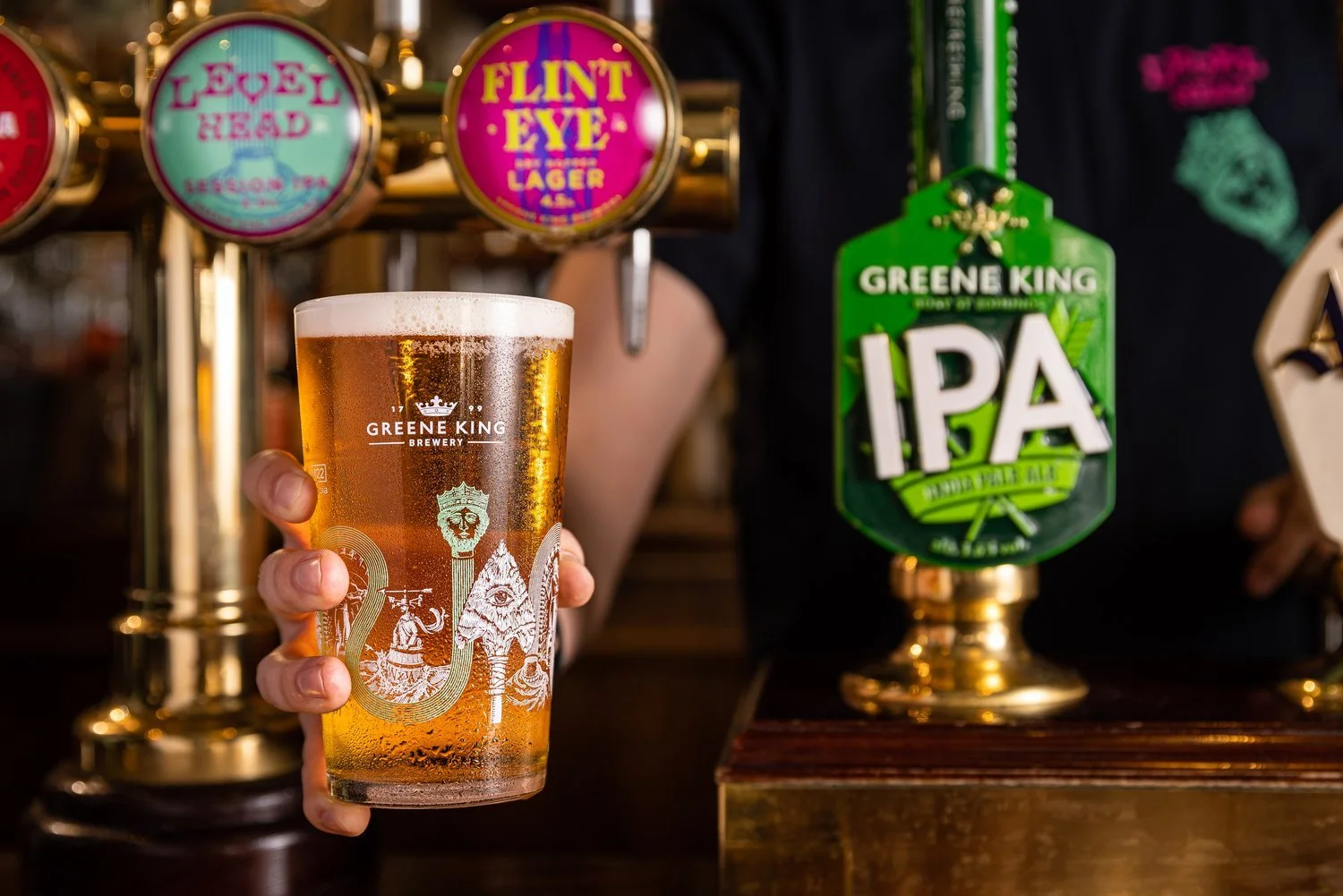 A person is holding a glass of pale golden beer with foam on top, branded with 'Greene King Brewery,' in a bar setting. Behind is a tap handle for Greene King IPA, a green beer tap, and other beer tap labels, including 'LADY HEAD' and 'FLINT EYED.'