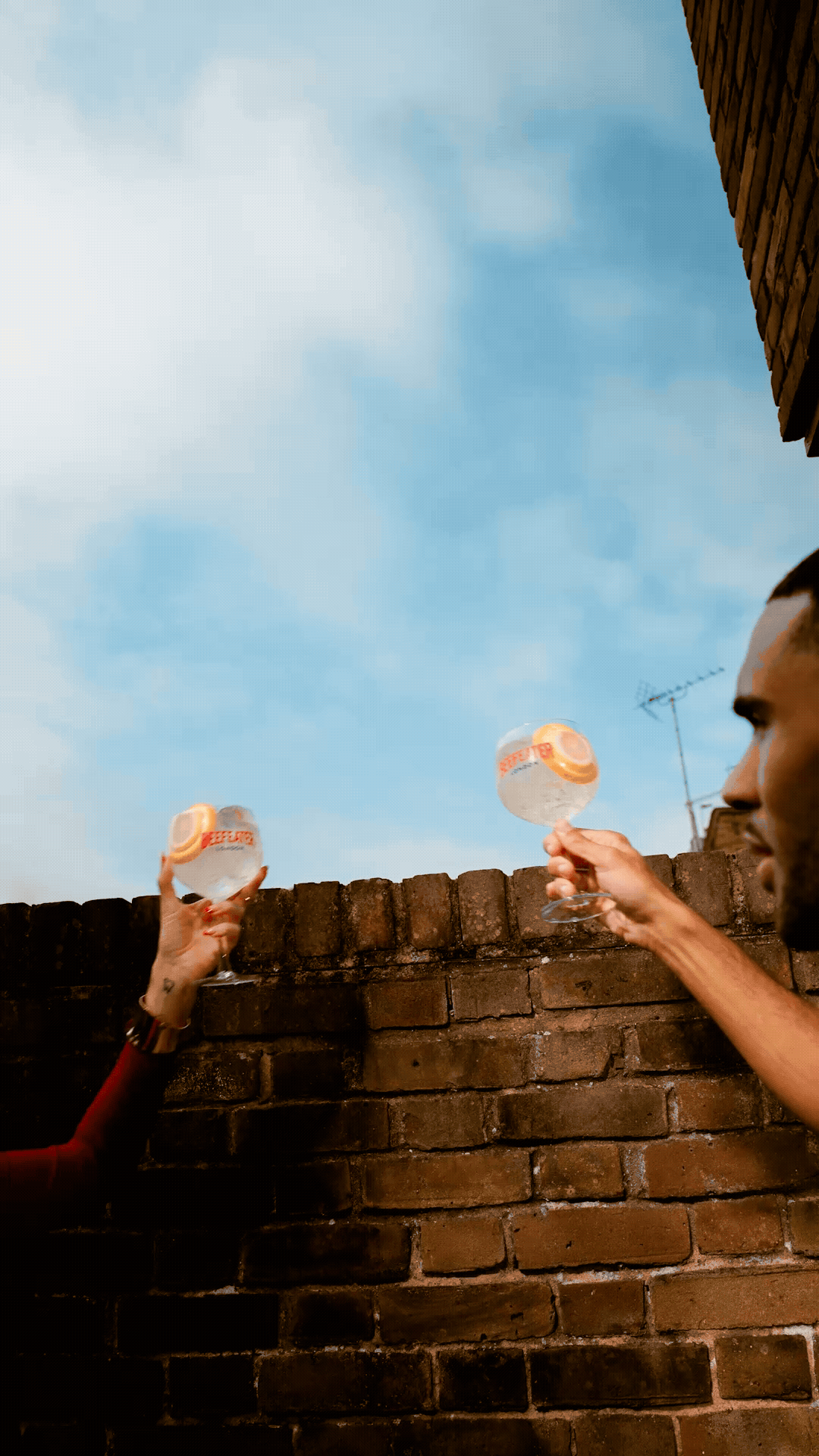 Person holding a bottle of Beefeater alcohol-free gin on a tiled surface.