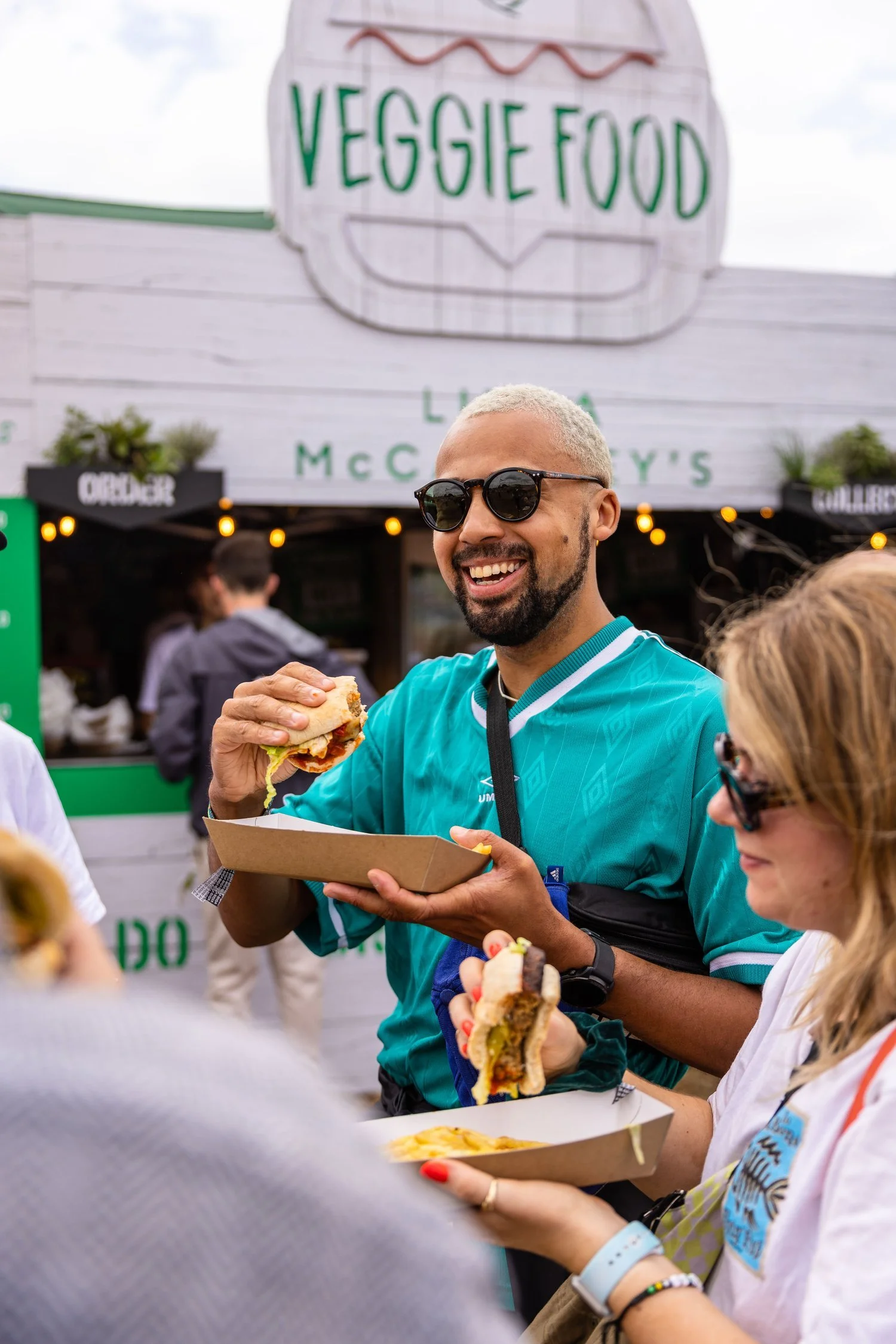 People enjoying food in front of a veggie food stand with a large sign that reads "Veggie Food" in green letters. The man in the center is smiling, wearing sunglasses and a teal sports jersey, holding a sandwich and a food container. Other individual