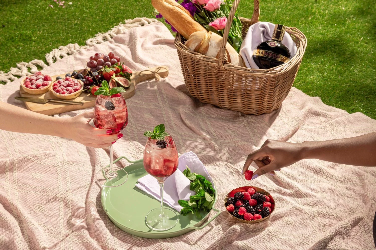 A picnic setup on a pink blanket with two glasses of berry drinks, a bowl of mixed berries, a basket with bread, flowers, and a bottle of Chambord liqueur.