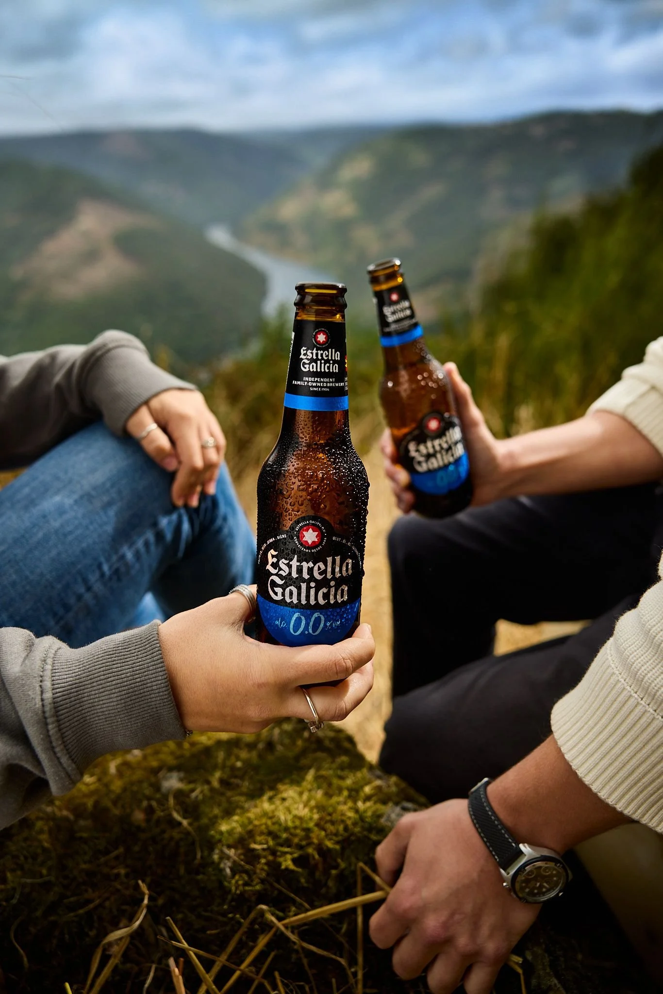 Three people sitting outdoors on a mossy surface, holding bottles of Estrella Galicia beer with a scenic view of hills and a winding river in the background.
