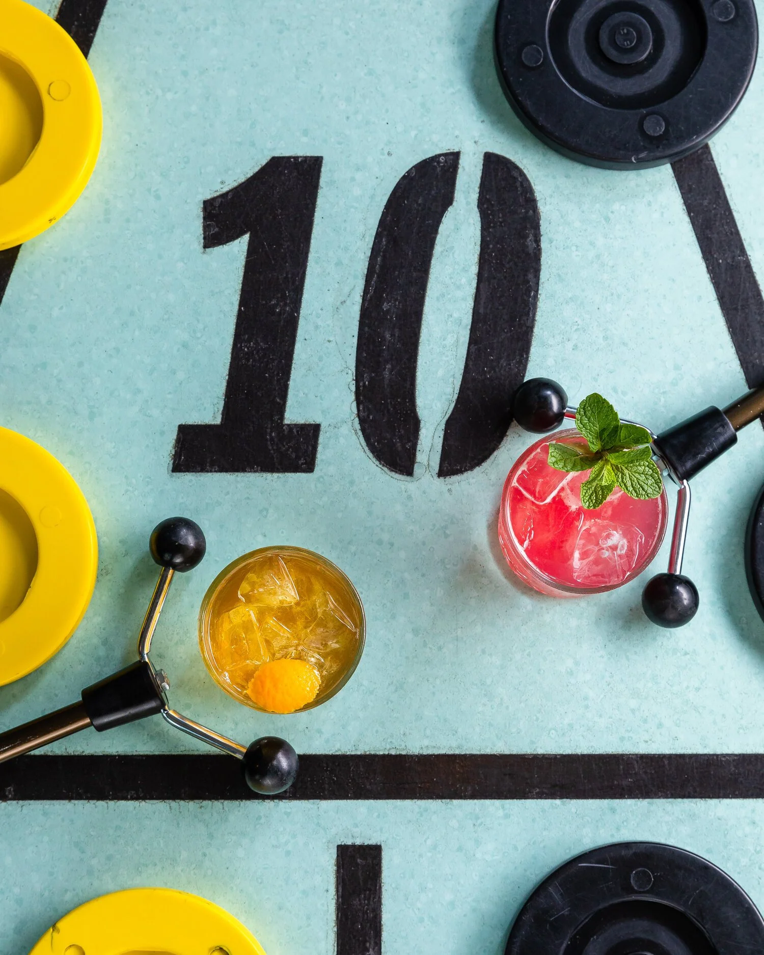 Close-up of a shuffleboard table with the number 10 painted on it, surrounding by yellow weights, black weights, and two cocktails with garnishes.