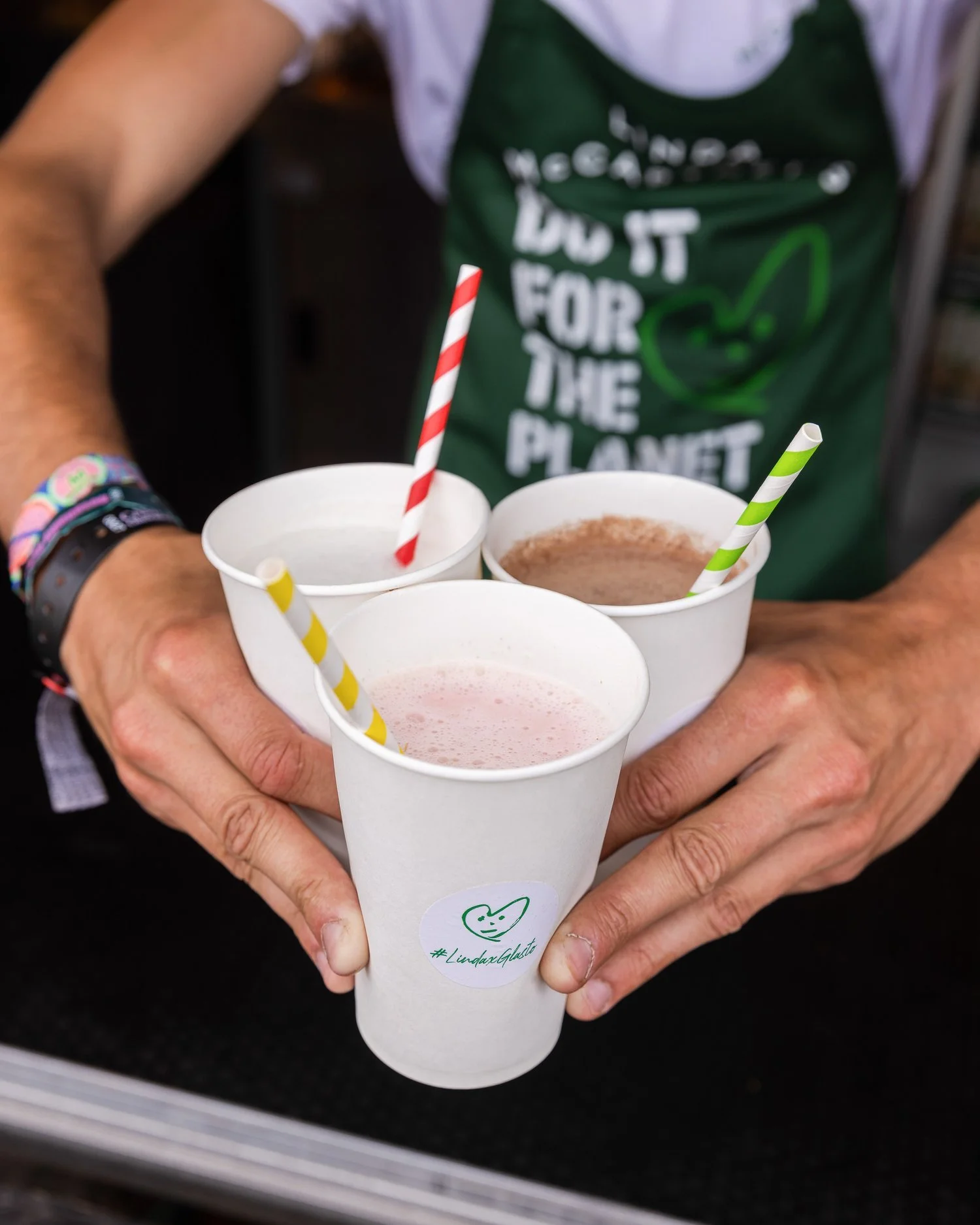 Person holding three cups of different colored smoothies with striped straws, wearing a green apron with a message about caring for the planet. View fullsize