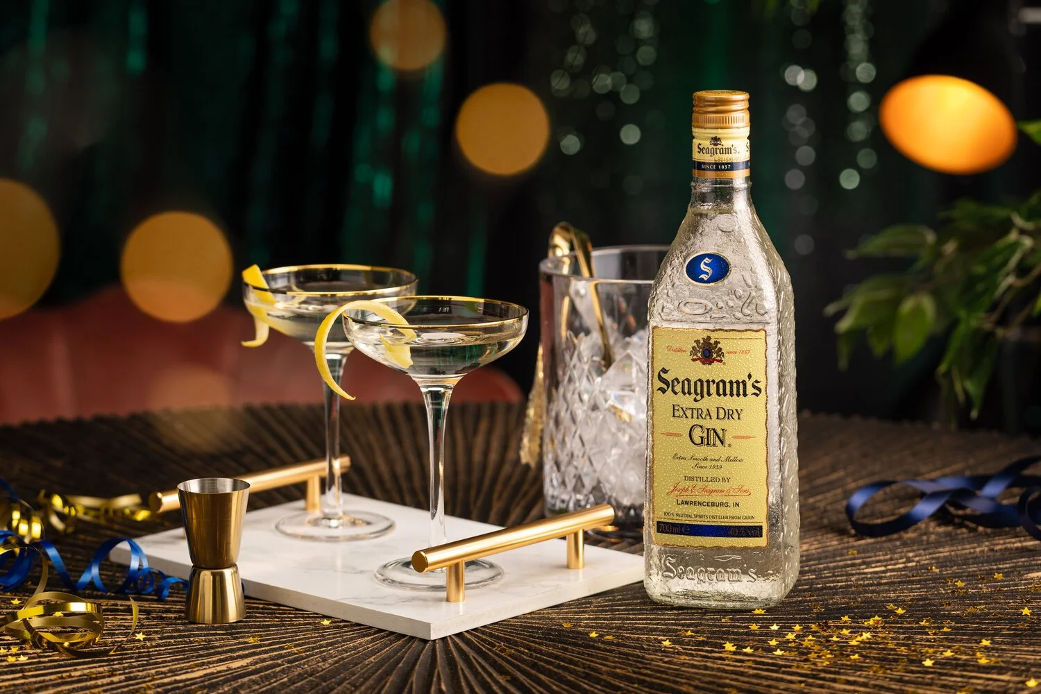 A bottle of Seagram's Extra Dry Gin with two cocktail glasses garnished with lemon twists, a metal jigger, and a container of ice on a decorative table, with hanging decorations and a dark background.