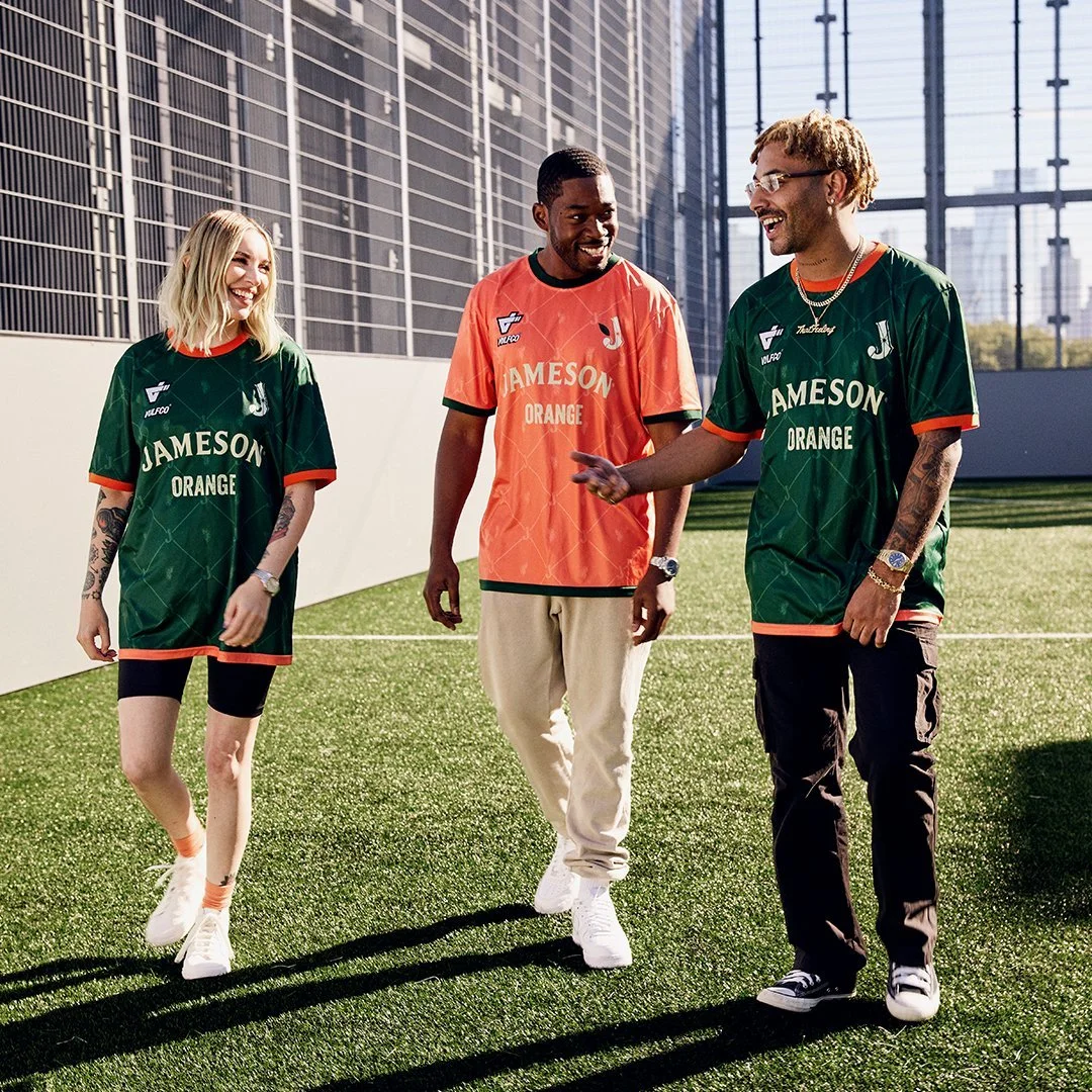 Three young adults, two men and one woman, walking and laughing on a sports field, wearing Juventus football jerseys, with tall glass buildings in the background.