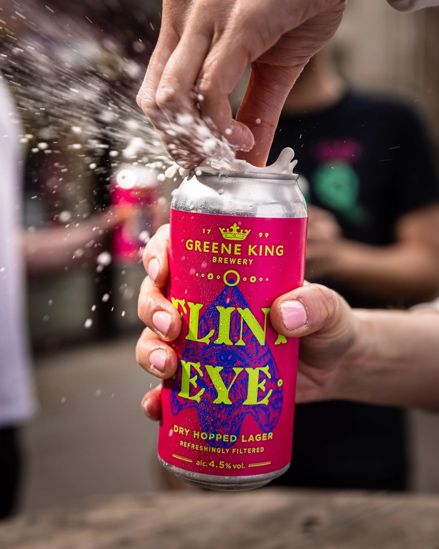 Person opening a can of Greene King Lyne Eye dry hopped lager, with foam splashing out.
