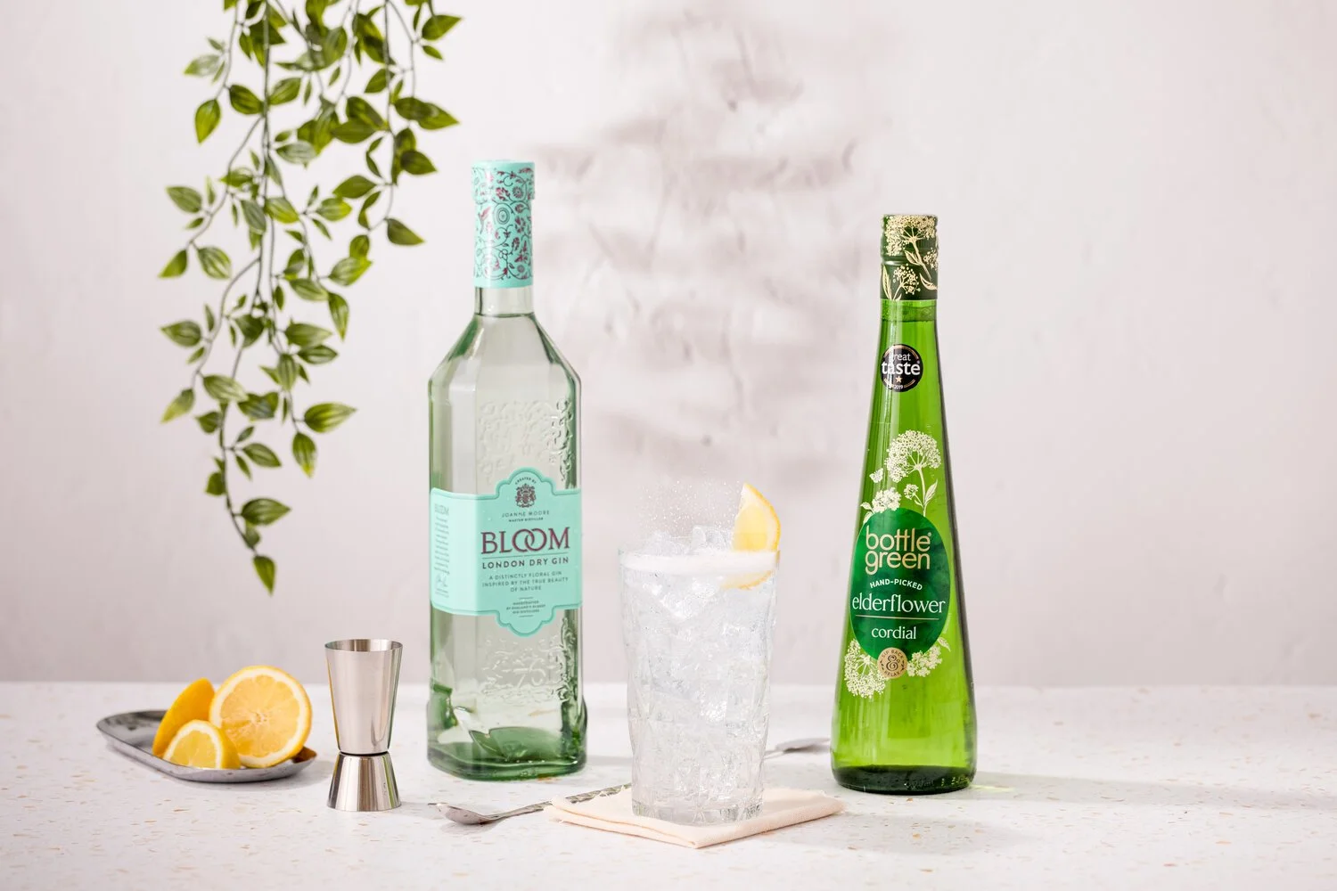 Bottle of Bloom London dry gin, Bottle Green elderflower cordial, a glass of sparkling water with a lemon wedge, a jigger, sliced lemons on a small dish, and a sprig of greenery hanging from above on a white countertop.