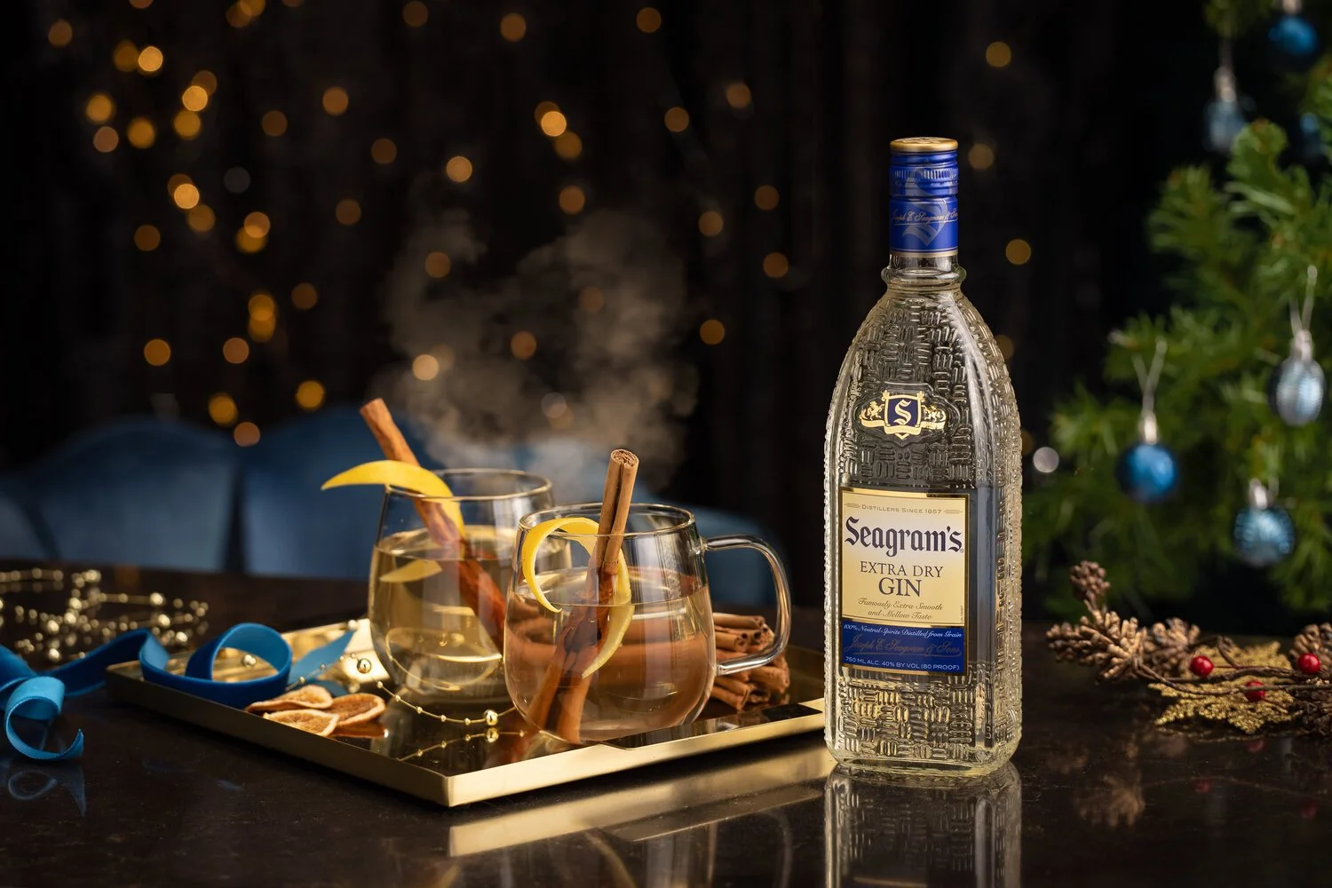 A bottle of Seagram's extra dry gin on a dark reflective surface, with two glasses filled with gin, lemon slices, and cinnamon sticks. The background features blurred holiday decorations and lights.