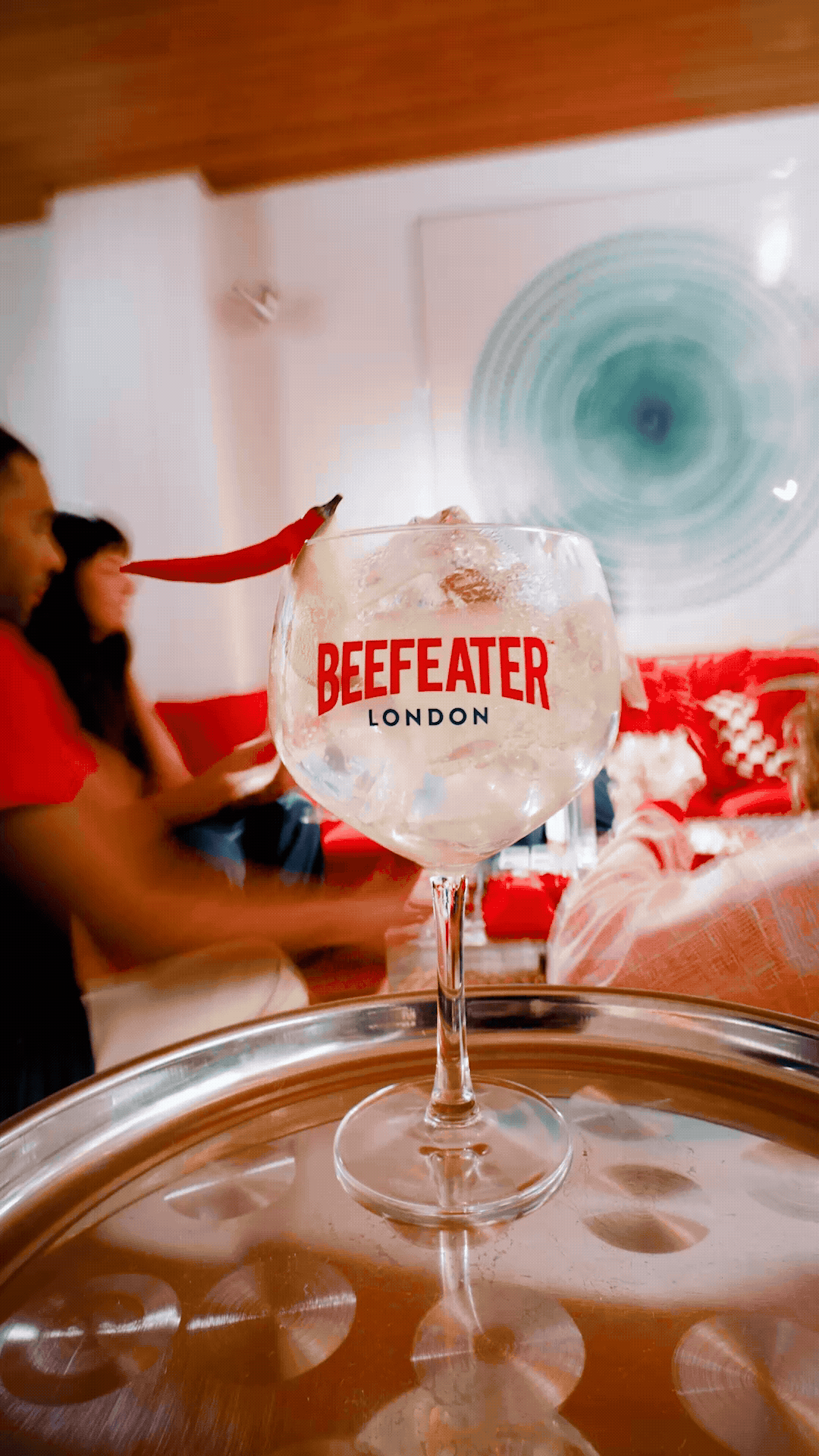 Close-up of a bottle of Beefeater London Gin on a red surface, with a vintage camera, sunglasses, and other items nearby.