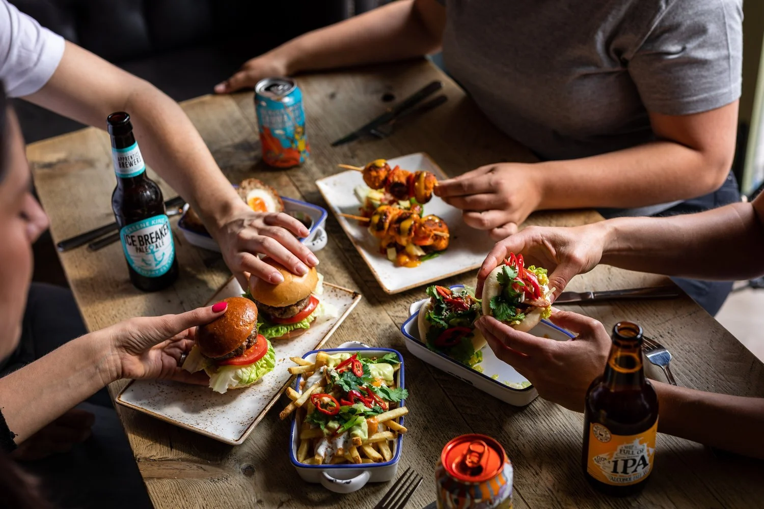 People enjoying a meal at a wooden table, sharing burgers, sliders, chicken skewers, fries, salads, and drinks including beer.
