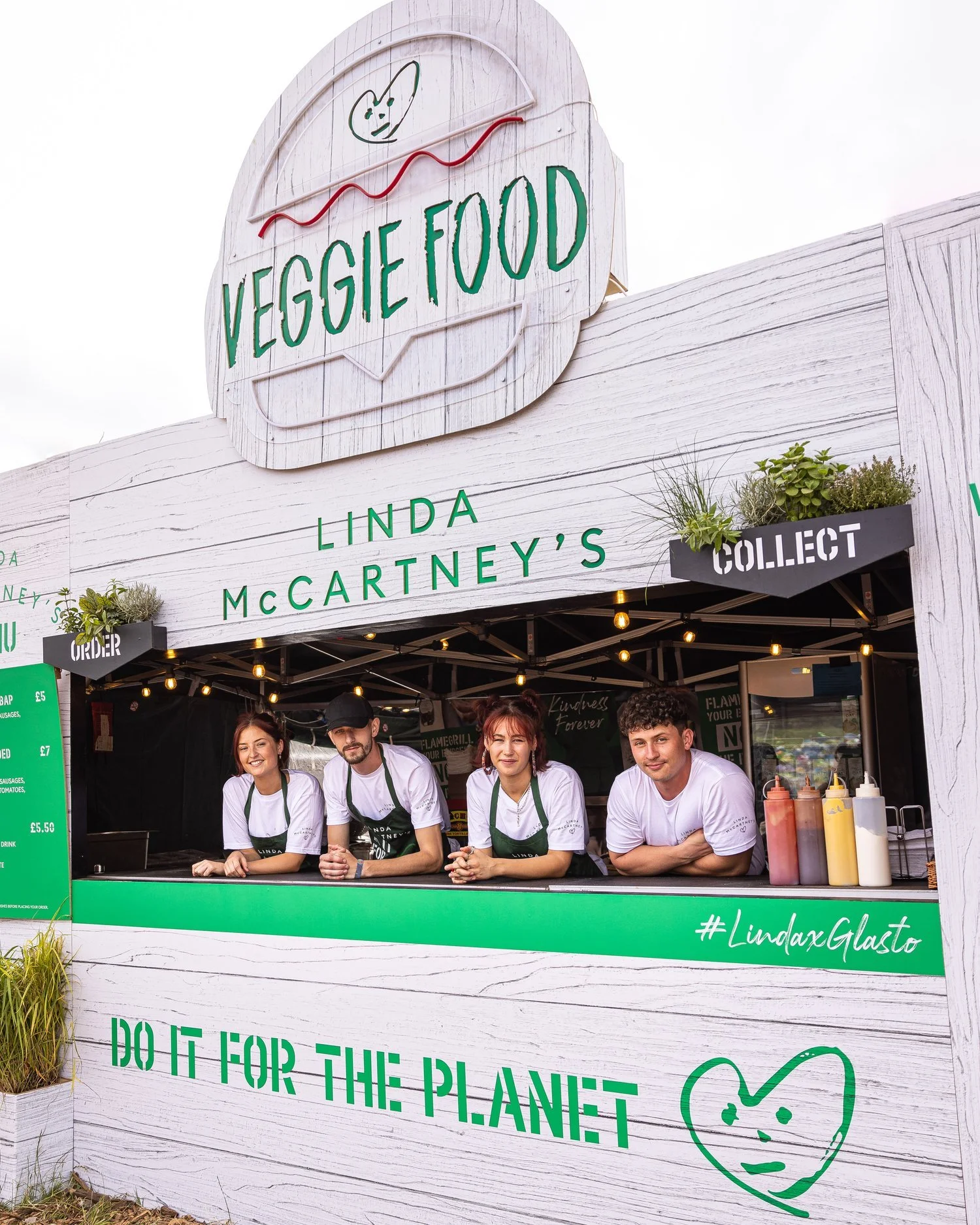 A food stand with a sign reading 'Veggie Food' by Linda McCartney's, featuring four people in white shirts and aprons inside, preparing or serving food at an outdoor event.