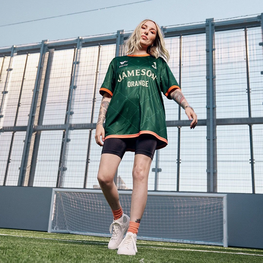 A woman with blonde hair wearing a green football jersey and black shorts, standing on a football field with a goalpost and tall fence in the background. View fullsize